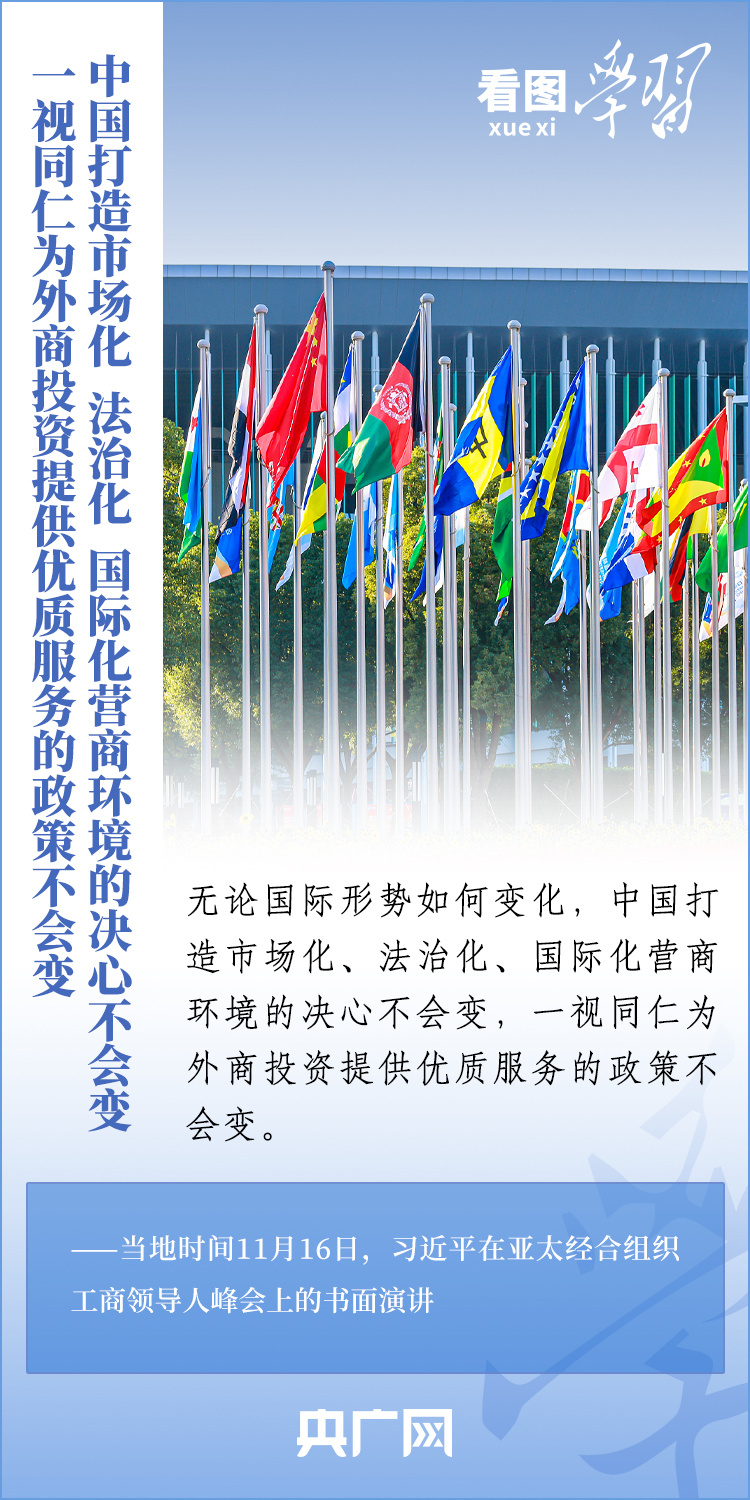 當(dāng)?shù)貢r(shí)間11月16日,國(guó)家主席習(xí)近平應(yīng)邀出席亞太經(jīng)合組織工商領(lǐng)導(dǎo)人峰會(huì)并發(fā)表書(shū)面演講。習(xí)主席深刻總結(jié)了亞太經(jīng)濟(jì)合作30年來(lái)非凡成就和啟示,對(duì)亞太合作下一個(gè)30年將走向何方這一新的時(shí)代之問(wèn)提出中國(guó)答案,重申“中國(guó)打造市場(chǎng)化、法治化、國(guó)際化營(yíng)商環(huán)境的決心不會(huì)變,一視同仁為外商投資提供優(yōu)質(zhì)服務(wù)的政策不會(huì)變”,向全球工商界發(fā)出邀請(qǐng),歡迎“積極參與中國(guó)式現(xiàn)代化進(jìn)程,共享中國(guó)高質(zhì)量發(fā)展帶來(lái)的巨大機(jī)遇!”一起來(lái)學(xué)習(xí)。