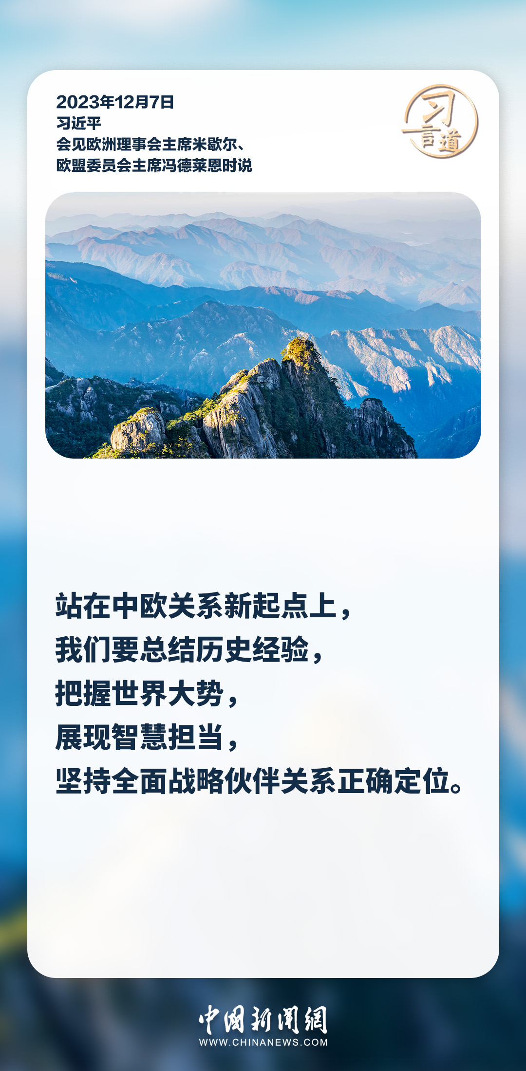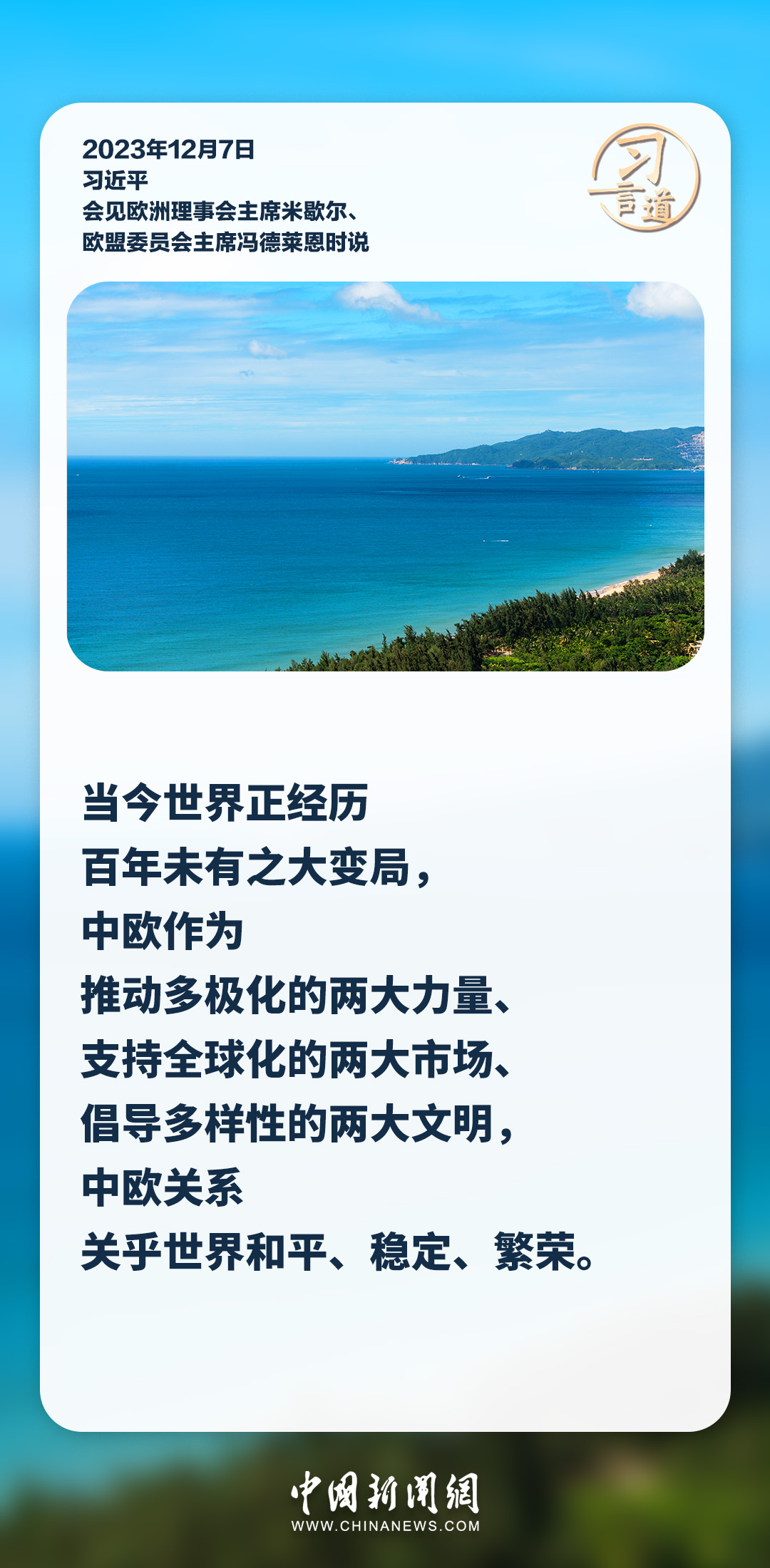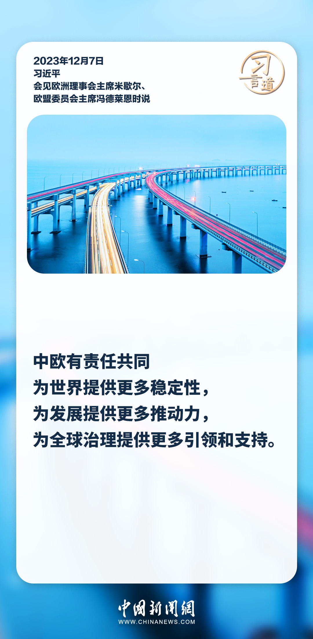 12月7日,國家主席習(xí)近平在釣魚臺國賓館會見來華舉行第二十四次中國—歐盟領(lǐng)導(dǎo)人會晤的歐洲理事會主席米歇爾和歐盟委員會主席馮德萊恩。習(xí)近平說——