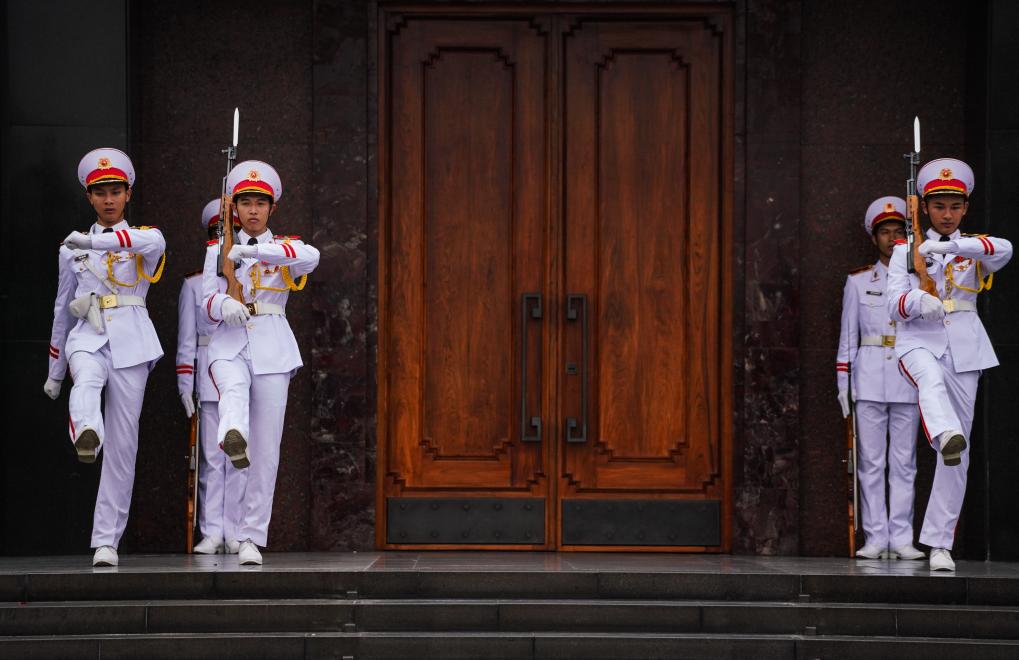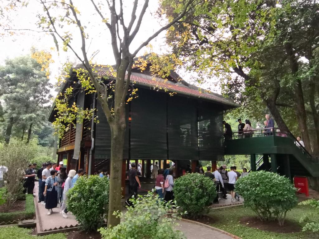 在河內地標巴亭廣場一側,坐落著胡志明陵和胡志明故居。記者抵達廣場時,守衛(wèi)胡志明陵的儀仗兵正在舉行換崗儀式,眾多民眾和游客高舉相機或手機,記錄下這莊嚴肅穆的一刻。胡志明陵北側的胡志明故居內,各國游客排起長隊,在他曾長期居住和工作的高腳屋下駐足留影。