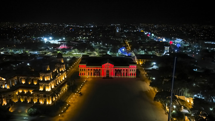 2022年1月31日,尼加拉瓜首都馬那瓜市中心標(biāo)志性建筑國家宮點亮“中國紅”(無人機照片)。