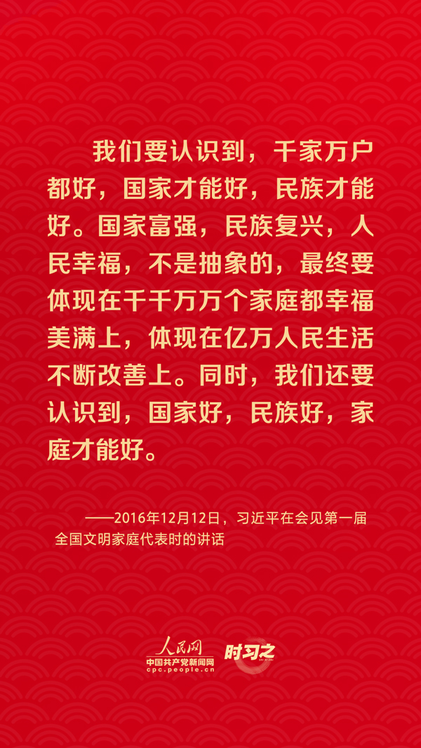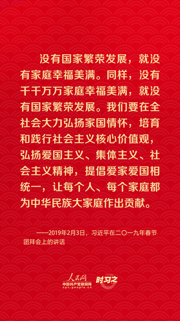 團圓是春節(jié)永恒的主題?!皼]有國家繁榮發(fā)展,就沒有家庭幸福美滿。同樣,沒有千千萬萬家庭幸福美滿,就沒有國家繁榮發(fā)展?!绷暯娇倳浽诙鄠€場合深刻闡述家庭與國家之間的關(guān)系,從他的話語里一起感悟深厚的家國情懷。