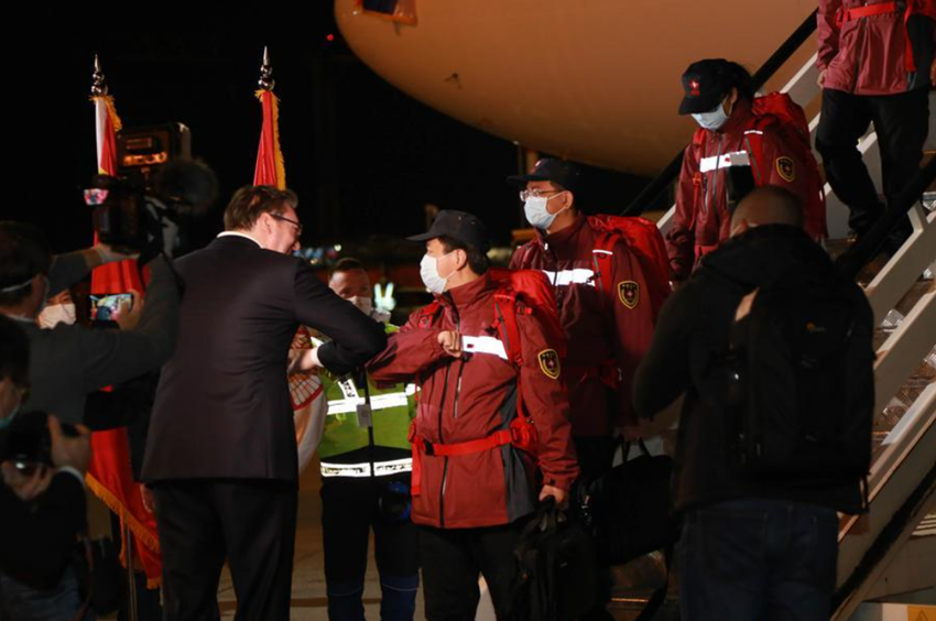 中國醫(yī)療團(tuán)隊(duì)在貝爾格萊德尼古拉·特斯拉機(jī)場(chǎng)降落時(shí)已是深夜。武契奇率領(lǐng)塞方多名高級(jí)官員到機(jī)場(chǎng)迎接。疫情期間不建議握手,于是這位塞爾維亞領(lǐng)導(dǎo)人選擇和中國專家團(tuán)成員一一碰肘以示尊重。對(duì)中國的及時(shí)支援心懷感激,他還在機(jī)場(chǎng)親吻了一面五星紅旗。