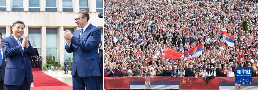 ??當(dāng)?shù)貢r(shí)間5月8日上午,國(guó)家主席習(xí)近平在貝爾格萊德塞爾維亞大廈同塞爾維亞總統(tǒng)武契奇舉行會(huì)談。會(huì)談前,武契奇陪同習(xí)近平來(lái)到政府大廈平臺(tái)(左圖)。大廈廣場(chǎng)上,一萬(wàn)五千名塞爾維亞民眾揮舞中塞兩國(guó)國(guó)旗,對(duì)習(xí)近平表示最熱烈的歡迎(右圖)。(拼版照片) 新華社記者 黃敬文 丁海濤 攝