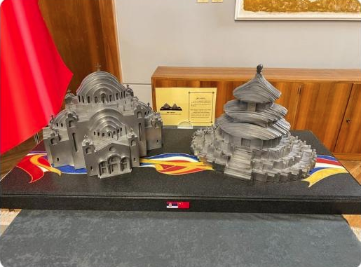 ??習(xí)近平主席送給武契奇兩件工藝品,分別是鋼材質(zhì)的天壇和圣薩瓦教堂造型。