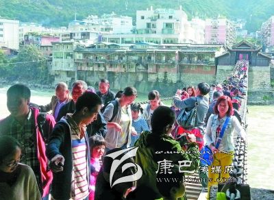 據(jù)縣文物局局長(zhǎng)郭成燕介紹,今年“十一”黃金周期間,游覽瀘定橋的游客較往年更理性,沒有出現(xiàn)井噴現(xiàn)象,每天游客量比較平穩(wěn)。游客主要以成都和重慶方向?yàn)橹鳎?5%以上的游客選擇自駕游出行。據(jù)悉,在10月2日這天,瀘定橋全天接待游客近萬人。為了確保游客安全,縣旅游部門在橋頭設(shè)立了安全警示牌,在游客高峰期,工作人員每5至10分鐘分批次放行,每次參觀放行不超過100人,并安排工作人員在瀘定橋中央疏導(dǎo)游客,確保游人安全。同時(shí),在瀘定橋頭滾動(dòng)播出參觀須知和瀘定橋介紹,引導(dǎo)游人參觀。黃金周期間,該縣旅游部門堅(jiān)持24小時(shí)值班,隨時(shí)對(duì)瀘定橋及周邊進(jìn)行安全巡查,確保安全。截至10月4日,參觀瀘定橋的游客約3.3萬人,門票收入達(dá)25萬多元。