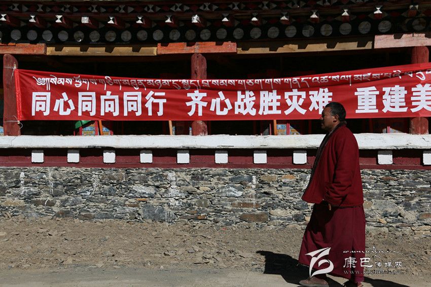 記者注意到,在金龍寺大門處的圍墻上貼著一面寫(xiě)有“同心同向,共渡難關(guān),重建家園”的紅色橫幅,一位僧人口中念念有詞,走過(guò)橫幅,向新搭建的救災(zāi)帳篷走去,另一位僧人則拿著一柄鋤頭走出寺院大門,隨同另一批救災(zāi)人員去處理前幾日垮塌在地的石頭。