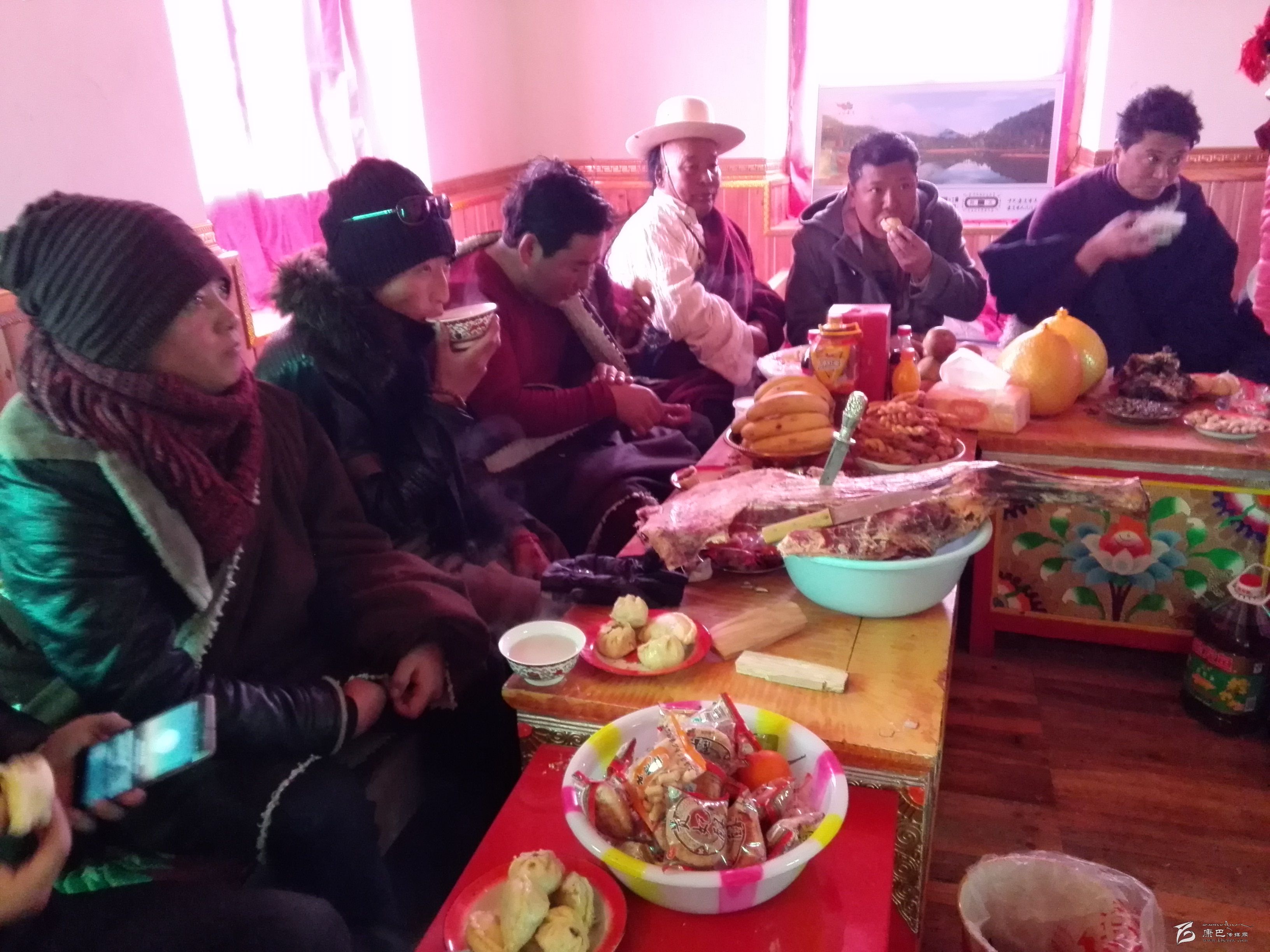 走進江巴達吉的家里,一股熱浪撲面而來,小鋼爐上燒著熱水,幾個女人正在備料準備包酥油包子和牛肉餃子。藏桌上擺滿了糖果、牛肉,豐盛的食物琳瑯滿目。江巴達吉愜意地喝著奶子茶,知足和幸福寫在臉上。