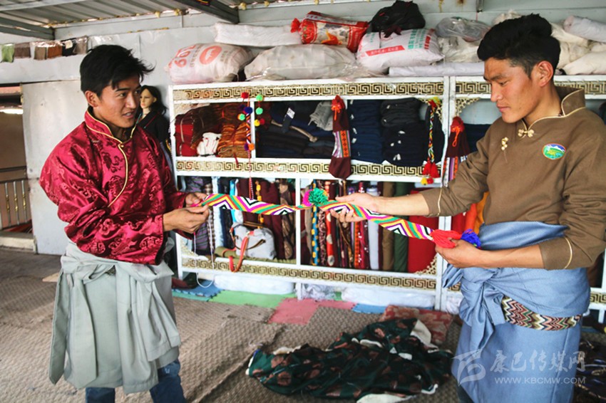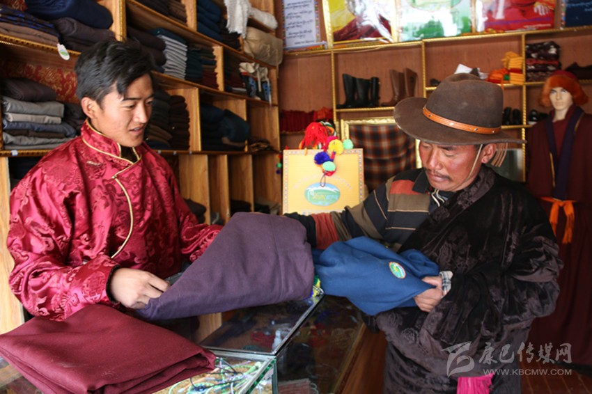 安孜鄉(xiāng)作為白玉縣海拔較高的鄉(xiāng)鎮(zhèn)之一,夏天是十分短暫的,連日來的晴好天氣,也透著絲絲寒氣。牧民阿剛想要量身定做一套過冬的藏裝,8月26日,他來到白玉縣阿察鎮(zhèn),一家民族服飾商貿(mào)公司吸引了他的目光?!拔覀冞@里的服裝面料是本地羊毛和從浙江進(jìn)的上等面料,做工考究,很多工序是純手工制作,服裝樣式你可以根據(jù)你的喜好指定,我們包你滿意?!钡陠T仁真熱情地介紹。聽了仁真的介紹,阿剛用手捻了一下服裝用料的質(zhì)地,看到印有“祥陽措”商標(biāo)的精美包裝袋,商店里擺放的五彩斑斕、高端大氣的藏式男女服裝,他有些動(dòng)心了。“生產(chǎn)這些服裝的都是我們納塔鄉(xiāng)的牧民,你可以考察我們的服裝用料、生產(chǎn)流程,再作打算?!比收鏌崆檠笠绲亟榻B說。