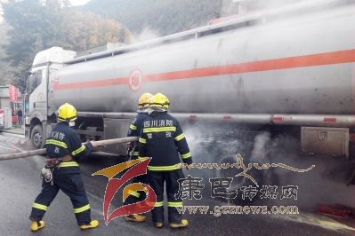 本網(wǎng)訊(夏俊林 文/圖)11月6日上午8點35分,康定縣南郊鬧市區(qū),一輛從稻城亞丁前往成都的油罐車后輪胎著火,沿街商戶行人驚恐逃避,及時趕來的消防員,5分鐘將火勢撲滅。