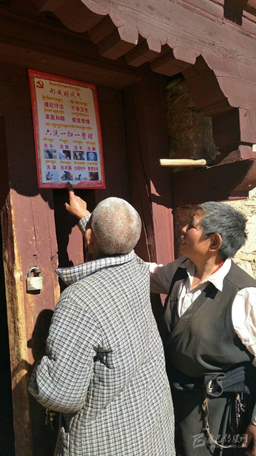 本網訊(扎西曲批 縣委中心報道組 葉強平 文/圖)11月9日,理塘縣甲洼鎮(zhèn)俄丁村老黨員格絨拉姆指著村民家門上掛的“六洗一掃一整理”紅牌,再次向村民講解宣傳相關要求,引導貧困群眾養(yǎng)成好習慣形成好風氣。