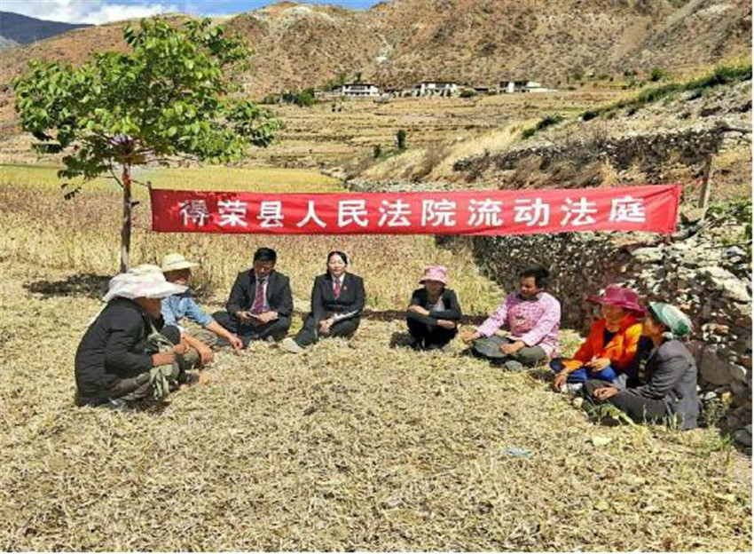 在曲雅貢鄉(xiāng)二號壩村進行法律宣講時,村民澤某請求法院判決其和丈夫扎某離婚,“流動法庭”法官立即在田間地頭組織調解。調解過程中當事人情緒抵觸、相互埋怨,尤其涉及到財產(chǎn)分割和子女撫養(yǎng)等問題時情緒波動大,場面一度僵持。法官憑借豐富的調解經(jīng)驗,先從講解相關法律規(guī)定入手,告知當事人享有的權利義務,而后對離婚財產(chǎn)分割、子女撫養(yǎng)問題從情理法多角度層層剖析,促使雙方達成和解協(xié)議,有效化解了矛盾。“流動法庭”以宣促調、以案說法,達到了審理一案、教育一片、穩(wěn)定一方的效果。