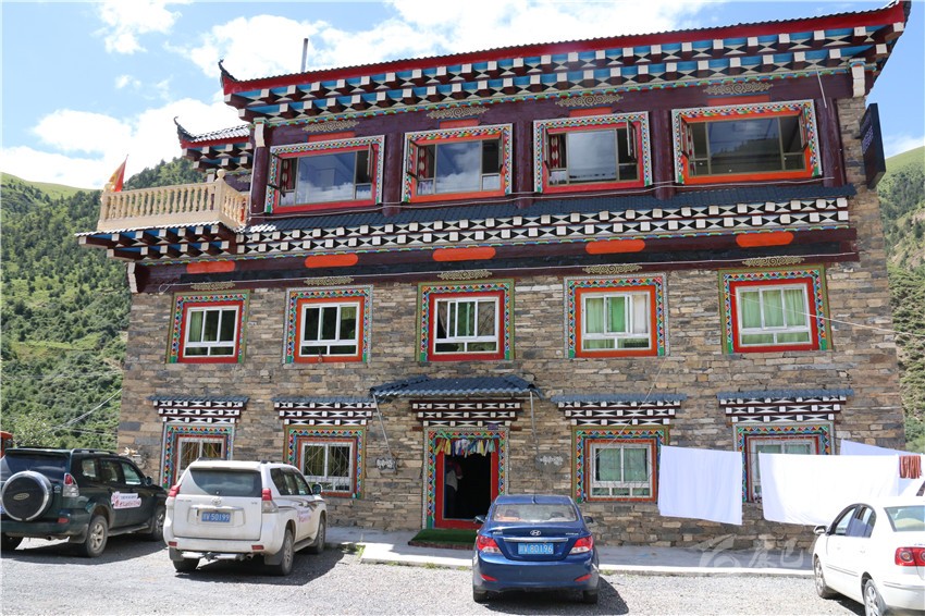 該酒店三樓一底,集餐飲、停車、住宿為一體,設(shè)單標間和套房共計22間38個床位,雇傭了3名當?shù)卮迕駧凸?,院?nèi)甚至配套了超市和茶樓;藏文化元素俯仰皆是,雕梁畫棟,規(guī)模配備,儼已成為全縣鄉(xiāng)鎮(zhèn)一道亮麗風(fēng)景。不論淡旺季,每間房價188元至258元不等。夏季正值入住高峰期,8月以來,幾乎天天客滿。