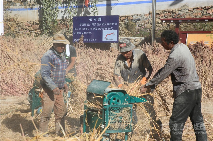 金秋的陽光熾熱溫暖,得榮縣白松鎮(zhèn)奪松村一片祥和安寧。11月10日,村民們正在村活動室的院壩里脫粒藜麥,豐收的喜悅寫在忙碌的村民的臉上?!按蠹壹佑透?,把藜麥交給公司,立馬可以拿到現(xiàn)錢?!眾Z松村委會副主任四郎都遷高興地說,盤點收成,今年又是一個豐收年。