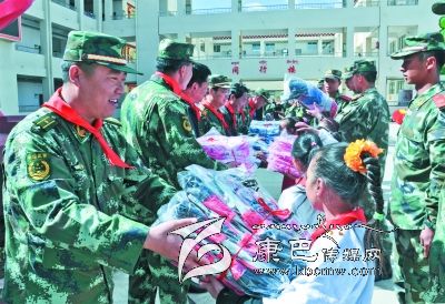 儀式上,8722部隊向?qū)W校贈送了價值萬余元的學習用品,拿著裝有鉛筆、水彩筆等各種文具的“愛心書包”,孩子們興奮不已。12歲的藏族女生登真啟珍告訴筆者:“今年的‘六一’兒童節(jié),武警部隊的叔叔們專門來看望我們,還送來了禮物,我感到特別開心。”儀式上,少先隊員們給參加慰問的部隊領(lǐng)導(dǎo)戴上鮮艷的紅領(lǐng)巾,孩子們還表演了精心排練的節(jié)目。一張張燦爛的笑臉,一陣陣蕩漾心扉的歌聲,傳遞著駐訓武警部隊與當?shù)厝罕姖鉂獾聂~水深情。