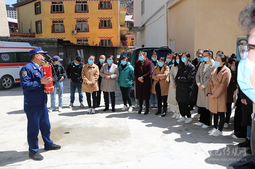 圖為宣講人員為縣醫(yī)院職工講解干粉滅火器的使用方法。