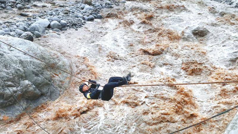 運(yùn)送帳篷的消防員,沿著Z字形的陡峭山路,螺旋式往目的地進(jìn)發(fā)。一道道桔紅色身影緩緩穿梭在翠綠的森林之中,汗水濕透了消防員的衣背,一顆顆汗珠沿著頭盔從前額落下。