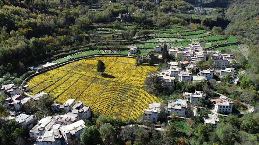 本網(wǎng)訊 金秋時(shí)節(jié),在丹巴縣巴底鎮(zhèn)邛山村的一片田地里,當(dāng)?shù)剞r(nóng)戶(hù)正在金絲皇菊基地里采摘菊花。35畝金絲皇菊迎風(fēng)綻放,成為當(dāng)?shù)孛利惖娘L(fēng)景。今年,該村采取“公司+合作社+農(nóng)戶(hù)”因地制宜種植金絲皇菊,讓群眾在家門(mén)口就業(yè),菊花種植產(chǎn)業(yè)打造了綠色生態(tài)美麗鄉(xiāng)村,吸引了不少游客前來(lái)游玩,成為當(dāng)?shù)厝罕娭赂辉鍪盏男侣纷印?/span>降初澤郎 吉靜 洛桑達(dá)瓦/文