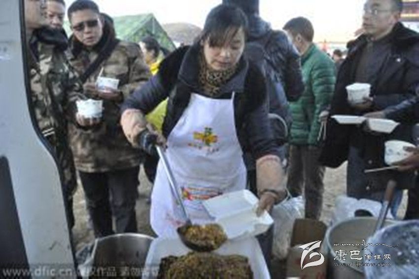 據(jù)了解,韓大哥是這家飯店的老板之一,他是仁壽縣人,幾年前和朋友來到新都橋開始經(jīng)營飯店。康定6.3級(jí)地震發(fā)生時(shí),他人在成都。但看到災(zāi)情發(fā)生,韓大哥立即和飯店另外幾個(gè)合伙人決定到安置點(diǎn)免費(fèi)送盒飯,“我在當(dāng)?shù)刈隽?、7年生意,現(xiàn)在出了事情,就應(yīng)該伸手支援嘛!”據(jù)韓大哥介紹,此次地震發(fā)生后,新都橋80%左右的飯店都已經(jīng)關(guān)門,他們的飯店因?yàn)檫€有一些接待工作,仍在正常營業(yè)。自11月23日晚上,他家的飯店就主動(dòng)為塔公鎮(zhèn)的安置點(diǎn)免費(fèi)派送盒飯,“包括中午和晚上兩頓,兩葷兩素一湯的配置。”因?yàn)樘?, 韓大哥來不及仔細(xì)統(tǒng)計(jì),他大概知道每天送出的盒飯?jiān)?200盒到1500盒之間,每天送出盒飯的成本在4、5千左右。但在他看來,這些其實(shí)都算不上什么,“能為災(zāi)區(qū)出一份力,我們就很滿足了,我們打算一直送到抗震救災(zāi)工作結(jié)束,也就是直到災(zāi)民有條件自己做飯的時(shí)候。”“這邊天氣很冷,他們吃的一般是些面包、牛奶之類的干糧,我們就是想讓大家吃到熱飯、熱菜。”據(jù)韓大哥介紹,每天飯店都會(huì)派出3、4個(gè)人將盒飯運(yùn)送到安置點(diǎn),“只要有人需要我們都會(huì)分發(fā)盒飯,包括一些志愿者和武警官兵也吃我們的飯。