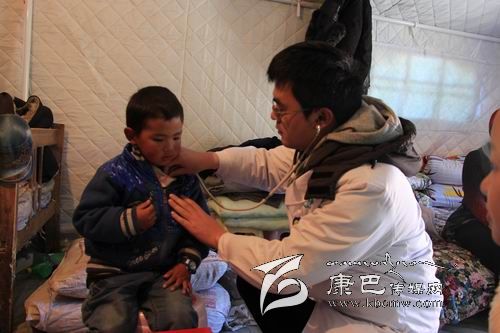 在新都橋鎮(zhèn)東俄洛三村的一頂救災帳篷里,來自“雅安市抗震救災醫(yī)療救援小組石棉分隊”的石棉縣人民醫(yī)院內科醫(yī)生李登豐正在給當?shù)貎和恋嵌嗉獧z查身體。土登多吉的母親說孩子這兩天感冒了,經(jīng)過檢查,李登豐發(fā)現(xiàn)土登多吉并未發(fā)燒,只是扁桃體有點發(fā)炎,于是趕緊讓同行的護理人員拿來了治療感冒和消炎的藥物。