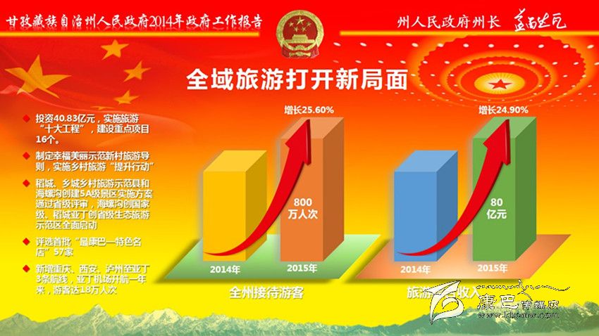 全域旅游打開新局面。投資40.83億元,實(shí)施旅游“十大工程”,建設(shè)重點(diǎn)項(xiàng)目16個。制定幸福美麗示范新村旅游導(dǎo)則,實(shí)施鄉(xiāng)村旅游“提升行動”;稻城、鄉(xiāng)城鄉(xiāng)村旅游示范縣和海螺溝創(chuàng)建5A級景區(qū)實(shí)施方案通過省級評審,海螺溝創(chuàng)國家級、稻城亞丁創(chuàng)省級生態(tài)旅游示范區(qū)全面啟動;評選首批“最康巴——特色名店”57家。新增重慶、西安、瀘州至亞丁3條航線,亞丁機(jī)場開航一年來,游客達(dá)18萬人次。全州接待游客800萬人次,實(shí)現(xiàn)旅游綜合收入80億元,分別增長25.6%和24.9%。全域旅游更加深入人心,旅游業(yè)正成為我州經(jīng)濟(jì)發(fā)展的“助推器”、群眾增收的“搖錢樹”。