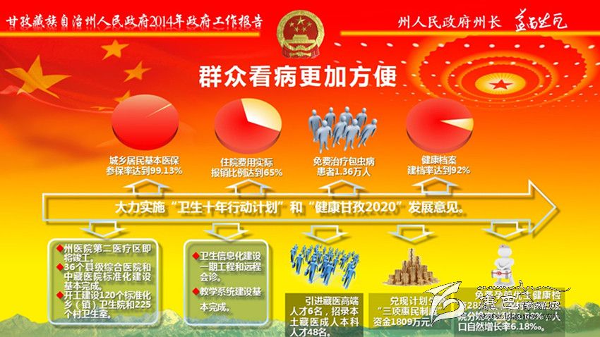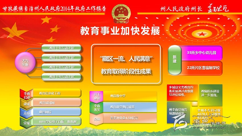 加大民生投入,全年民生支出139億元。全州城鎮(zhèn)新增就業(yè)7400人,城鄉(xiāng)低保實(shí)現(xiàn)應(yīng)保盡保;在全省民族地區(qū)率先實(shí)施醫(yī)療保險(xiǎn)制度城鄉(xiāng)統(tǒng)籌,異地就醫(yī)即時結(jié)算全面啟動;在全省率先出臺大病醫(yī)療保險(xiǎn)規(guī)定。教育事業(yè)加快發(fā)展。新建35所鄉(xiāng)中心幼兒園、22所片區(qū)寄宿制學(xué)校,州高級中學(xué)開工建設(shè)。全面落實(shí)教育助學(xué)惠民政策,兌現(xiàn)各類補(bǔ)助金4.58億元。城鄉(xiāng)居民基本醫(yī)保參保率達(dá)到99.13%,健康檔案建檔率達(dá)到92%;開工建設(shè)120個標(biāo)準(zhǔn)化鄉(xiāng)(鎮(zhèn))衛(wèi)生院和225個村衛(wèi)生室;衛(wèi)生信息化建設(shè)一期工程和遠(yuǎn)程會診、教學(xué)系統(tǒng)建設(shè)基本完成;兌現(xiàn)計(jì)劃生育“三項(xiàng)惠民制度”資金1809萬元。群眾文化生活日益豐富。建成縣“兩館”12個;開工建設(shè)州民族體育館、州農(nóng)牧民演藝培訓(xùn)中心和14個縣級全民健身中心,建成農(nóng)民體育健身工程739個;開展 “送文化下鄉(xiāng)”近千場;康巴文化研究院“四大工程”全面啟動。深入實(shí)施“百千萬康巴英才工程”,人才科技工作扎實(shí)有效。扶貧移民工作成效明顯。完成1360個貧困村、19.91萬扶貧對象立卡建檔工作;實(shí)施整村推進(jìn)63個、連片開發(fā)項(xiàng)目4個、彝家新寨(村)17個、索改橋23座,易地扶貧搬遷9850人,2.65萬群眾生產(chǎn)生活條件得到改善。