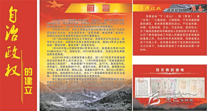 《甘孜州檔案館愛國主義教育基地》的整個(gè)展覽分為四大板塊。第一部分命名為“自治政權(quán)的建立”,向參觀者介紹了甘孜藏族自治州誕生的歷史過程;第二部分是“民主改革運(yùn)動(dòng)”,把人們帶回了那段不能忘記的烽火歲月;第三部分是“社會主義建設(shè)”,深情地回顧了在建設(shè)社會主義事業(yè)中我州所取得的不平凡的成就;第四部分是“改革開放”,讓人們重溫了在改革開放的大潮中所經(jīng)歷的那些充滿激情的經(jīng)歷。
