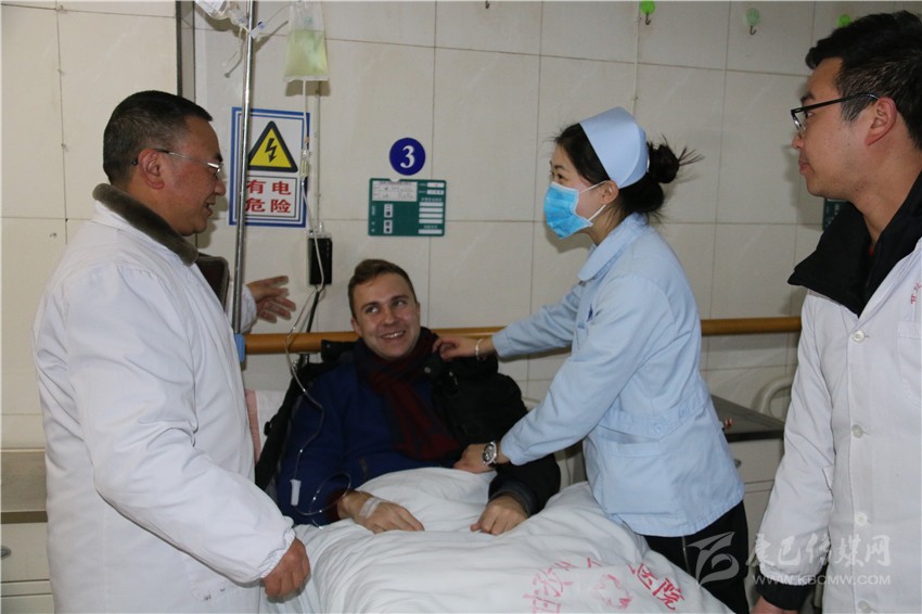 和國醫(yī)生正在給臨床病人檢查病情。一位來康定玩的俄羅斯小伙因患重感冒住進(jìn)了急救中心。正在輸液的他用比較熟練的中文激動(dòng)地告訴記者:“這里的醫(yī)生服務(wù)很好,他們過年都沒有休息,我得了重感冒,經(jīng)過治療以及在他們的細(xì)心關(guān)照下,我的病情好多了。”