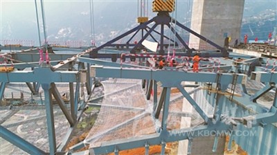 無人機先牽引一根2毫米“韓國絲”(韓國進口的強韌性尼龍繩)布設兩岸橋塔,然后在2毫米“韓國絲”的“幫襯”下布設4毫米“韓國絲”,再到6毫米“韓國絲”,又到8毫米“韓國絲”,在這種相互“提攜”下布設上下各1根32毫米鋼索形成牽引系統(tǒng),用拽拉器布設錨道,進行兩根主纜施工。主纜直徑達76厘米,由187股鋼繩組成,每根鋼繩由91根直徑5.3毫米長度1700米的特性鋼絲構成,兩根主纜所用鋼絲總長達60000千米,可繞地球一周半