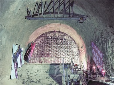隧道式錨碇建設運用系列實用型發(fā)明創(chuàng)新,發(fā)掘有利條件,利用瀘定隧道橫洞,采用平移系統(tǒng)安全、高效地轉(zhuǎn)運鋼拉桿;進入隧道錨工作區(qū)域后,在洞內(nèi)安裝纜索吊裝系統(tǒng)進行鋼拉桿安裝,安裝過程中通過人工配合手拉葫蘆進行精確微調(diào),實現(xiàn)了高強度鋼拉桿在狹窄、封閉的錨洞中的轉(zhuǎn)運、安裝和精確定位。