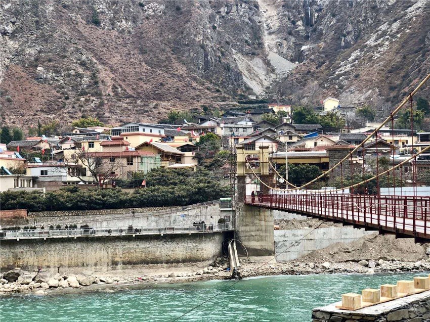 來到時濟鄉(xiāng),鐵索橋對岸就是若吉村,流淌的大渡河水從橋下穿過,若吉村內正在進行民居風貌升級改造,一些改造的民居外形已初顯。