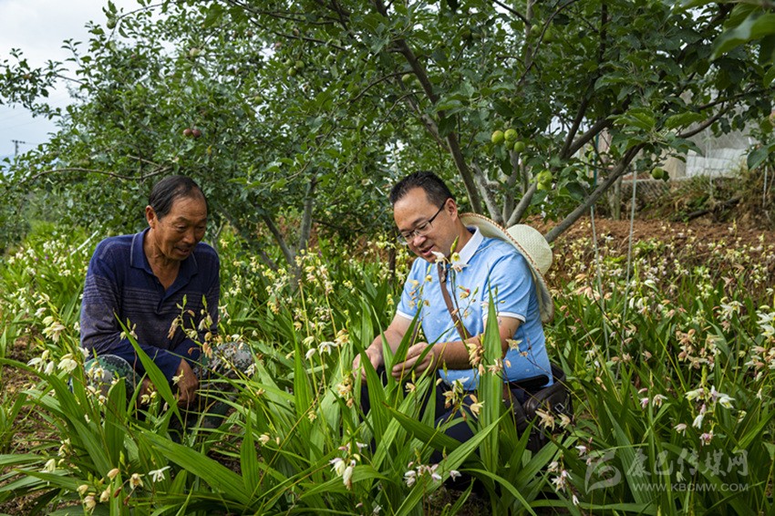 王昇與技術能手一起研究“林下種植養(yǎng)殖”的方法。
