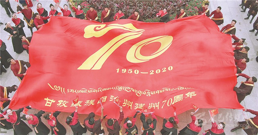 美妙的歌聲縈繞四方,鮮艷的旗幟迎風(fēng)飄揚。就在眾人忘情高歌之時,來自州歌舞團的50多名演員將一面巨大的印有“建州70年Logo”的紅旗,在廣場正中鋪展開來。以這面旗幟為中心,先后到來的人們組成了三個同心圓,用歌聲禮贊甘孜州建州70周年。