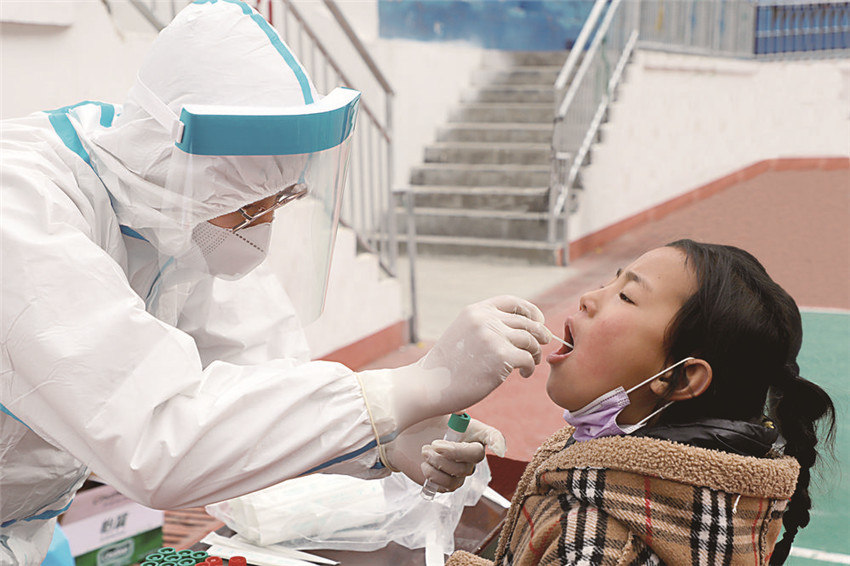 圖為醫(yī)護(hù)人員正在為學(xué)生做核酸檢測。