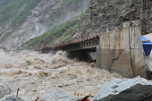 6月29日,恰逢周末,但在該公司的防汛指揮中心已是繁忙緊張氣氛,防汛值班員雖已熬紅了雙眼,緊盯著監(jiān)視屏并時(shí)刻保持與前方的聯(lián)系;7時(shí)23分,該公司副總經(jīng)理杜三林,長(zhǎng)河壩工程部、安全環(huán)保部相關(guān)負(fù)責(zé)人來(lái)到了指揮中心;8時(shí),流量逼近4170立方米每秒;10時(shí),流量超過(guò)4200立方米每秒,已超過(guò)該工程自2010年開(kāi)工以來(lái)最大流量,整個(gè)指揮中心的氣氛變得隨之凝重起來(lái);10時(shí)30分至11時(shí),指揮中心接連收到施工單位電話險(xiǎn)情報(bào)告:此時(shí)此刻,長(zhǎng)河壩工程初期導(dǎo)流洞水勢(shì)兇猛,導(dǎo)流洞出口橋0號(hào)橋臺(tái)回填料淘刷嚴(yán)重,1號(hào)橋墩發(fā)生傾斜,橋梁隨時(shí)有傾覆的可能,將會(huì)危及下游圍堰高程最低的中水十四局、中水五局營(yíng)地的安全,更將會(huì)危及到300余名員工的人身安全;金湯河突發(fā)特大洪水,沖垮了通往金湯土料場(chǎng)的場(chǎng)內(nèi)公路,沿線山體已發(fā)生了小型泥石流,土料場(chǎng)通訊、交通已全部中斷,急需救援;持續(xù)降雨引發(fā)響水溝泥石流,3萬(wàn)余立方米泥石流堆積物順溝而下,沖垮了響水溝石料場(chǎng)的鋼橋,并堵塞了場(chǎng)內(nèi)12號(hào)路1號(hào)隧道。必須馬上清運(yùn)疏通,否則,響水溝再發(fā)泥石流,長(zhǎng)河壩上游圍堰和大壩填筑工作面將直接面臨泥石流堆積物的直接沖擊,險(xiǎn)情萬(wàn)分緊急!
