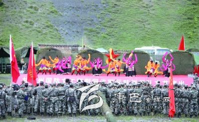 慰問演出在獨(dú)立營戰(zhàn)士的拉歌聲中徐徐拉開帷幕,隨后,《北京的金山上》、《我的士兵兄弟》等一首首耳熟能詳?shù)母枨鹨簧涎??!稓g歌踏舞》、《盛世歡歌》等舞蹈,時(shí)而歡快跳躍,時(shí)而雄壯豪邁,歌曲《說句心里話》唱出了官兵的思念之情,也唱出了官兵們保家衛(wèi)國的心聲。整場演出在舞蹈《康巴人》中落下帷幕。