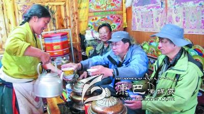 位于宗塔草原“大盆地”東邊山坡的降巴牧場在隊(duì)員們的心里也留下了深刻的印記。15日早上5點(diǎn)半隊(duì)員們就出發(fā)上了降巴牧場。朝霞映紅了天邊,紅云罩著青草牛糞味飄香的草坡。比采風(fēng)隊(duì)員們起得更早的牧人已擠完了牛奶,一個(gè)僅10 歲的女孩正在草坡上拾牛糞;牛毛帳篷里,勤勞的牧婦已打開了牛奶分離器開始分離酥油了……一問,方知牧民們今晨4點(diǎn)就起床勞作,干完早上的活兒,他們要趕到三公里遠(yuǎn)的“盆地”耍壩子,看賽馬。這個(gè)牧場靜謐潔凈得令人稱奇,青青的草坡上絕少有垃圾存留,沒見到一只兇惡的牧犬;按季節(jié)劃分的草場由整潔的網(wǎng)圍欄圈開,分隔有致;牧人舉家出門,連帳篷門也不掩,據(jù)說這里沒有偷盜發(fā)生,家人和諧;古老、平和的氣氛中,晨風(fēng)輕拂,野花青草搖曳,輕柔的晨霧中偶而傳來兩聲牛哞,讓人頓感心靜如水。對于長期居住城市的人來說,這里無疑是“幽雅天堂”了。