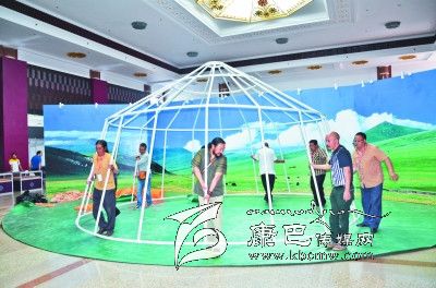 工作人員正在搭建虎皮帳篷