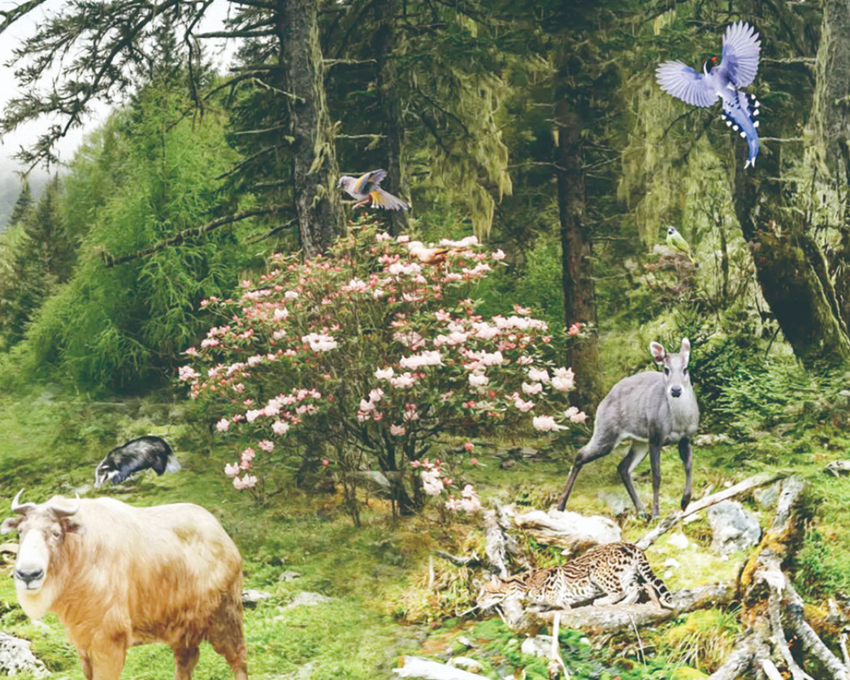 一入館,展覽主題“貢嘎,眾生的家園”偌大字樣映入眼簾;隨即,序廳同“神性貢嘎”“橫斷之巔”“貢嘎生靈”“貢嘎前緣”“無(wú)聲守望”5大展區(qū),在這500平方米的場(chǎng)館空間內(nèi)按照觀覽動(dòng)線科學(xué)串聯(lián),貢嘎山區(qū)域內(nèi)的地理空間、地質(zhì)變遷、生態(tài)演化、自然風(fēng)光、保護(hù)成果等一覽無(wú)遺,“蜀山之王”原生生境鋪展眼前。