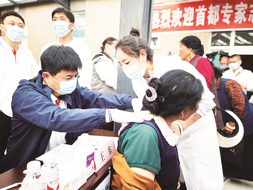 排隊、分診、診斷……在巴塘縣義診現(xiàn)場,每一位身著白衣、口音輕柔的醫(yī)生面前都有數(shù)名等待問診的群眾。來自北京大學第一醫(yī)院、解放軍第八醫(yī)學中心、北京航天總醫(yī)院等醫(yī)療機構,涵蓋腎臟、中醫(yī)、骨科、肝病科疾病等多個領域的專家團隊正為前來問診的群眾提供多學科專業(yè)義診服務,并就常見疾病耐心細致地為患者及家屬答疑解惑。