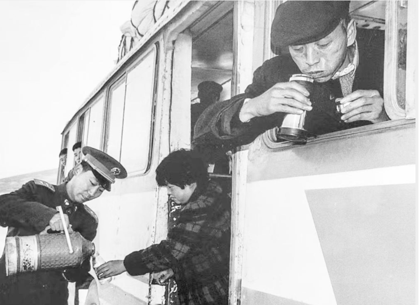 90年代,官兵為過(guò)往車輛提供開水。