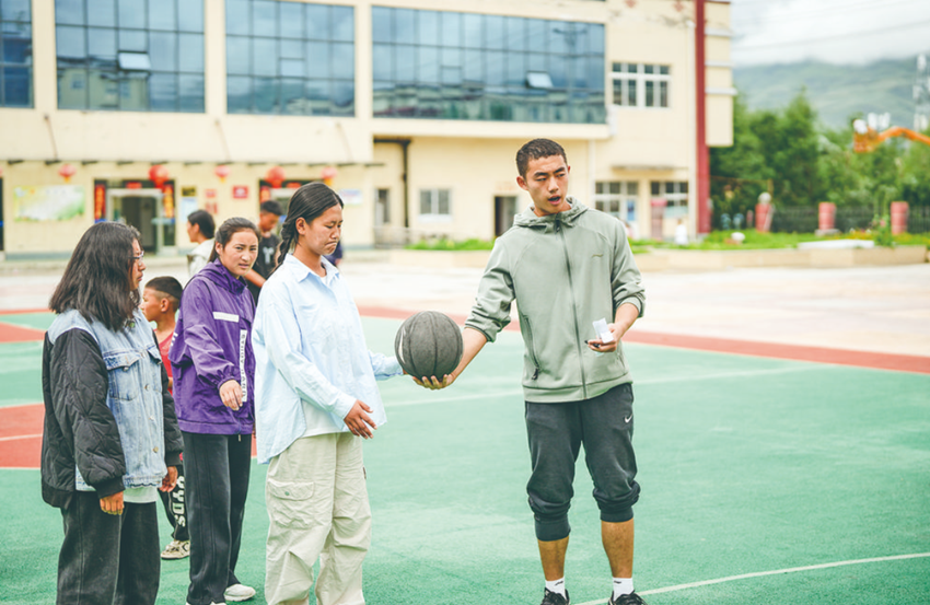 “天空之城”團隊成員教孩子們打籃球。
