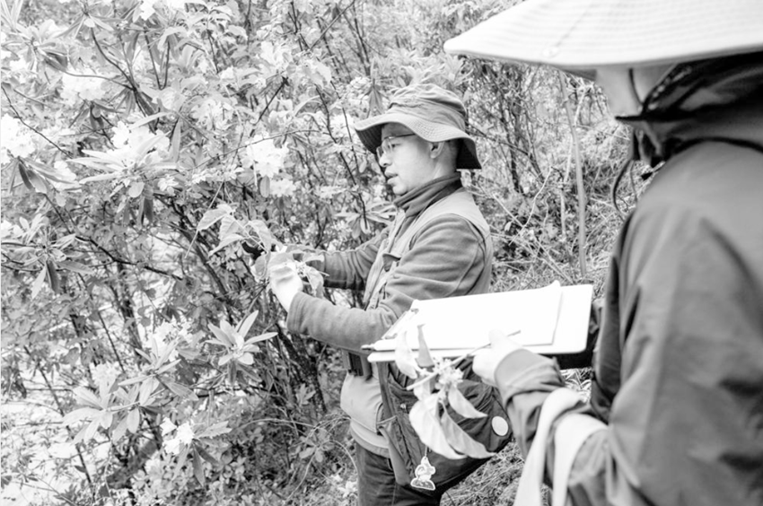 回到山腳,張遠(yuǎn)彬正在打開植物“盲盒”?!斑@里海拔差別大,杜鵑的種類特別多,這是以前沒有記錄到的?!睆堖h(yuǎn)彬直呼“驚喜”,邊用手機拍下形態(tài),邊口述特征讓一旁的助手記錄。