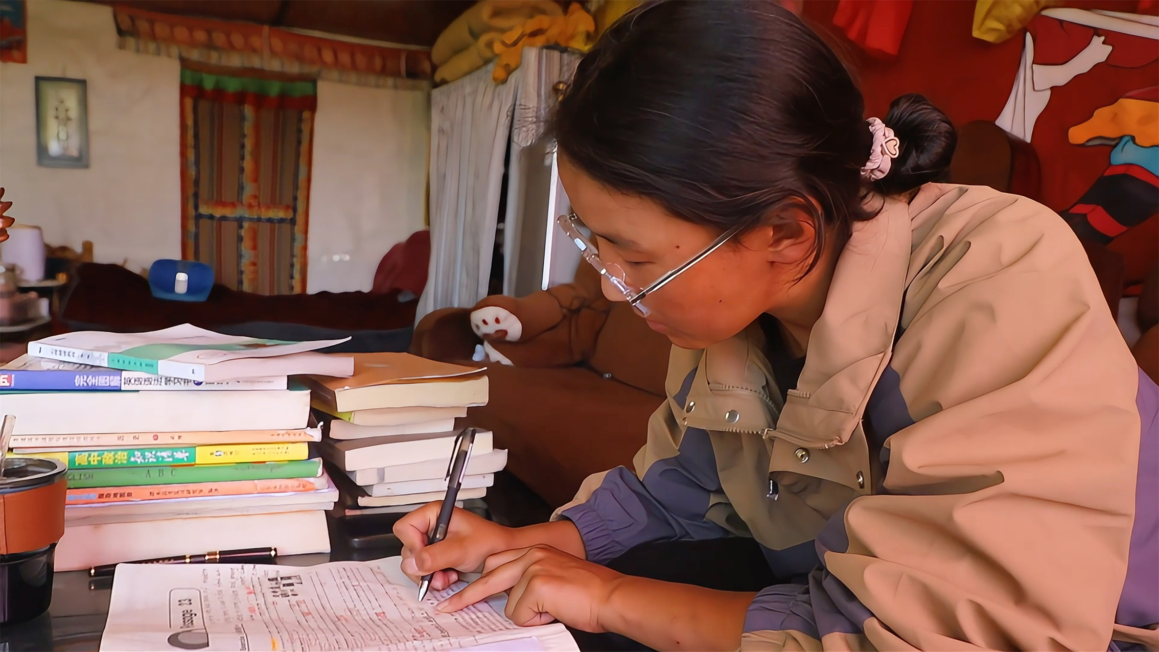 扎西拉姆在家學(xué)習(xí)。