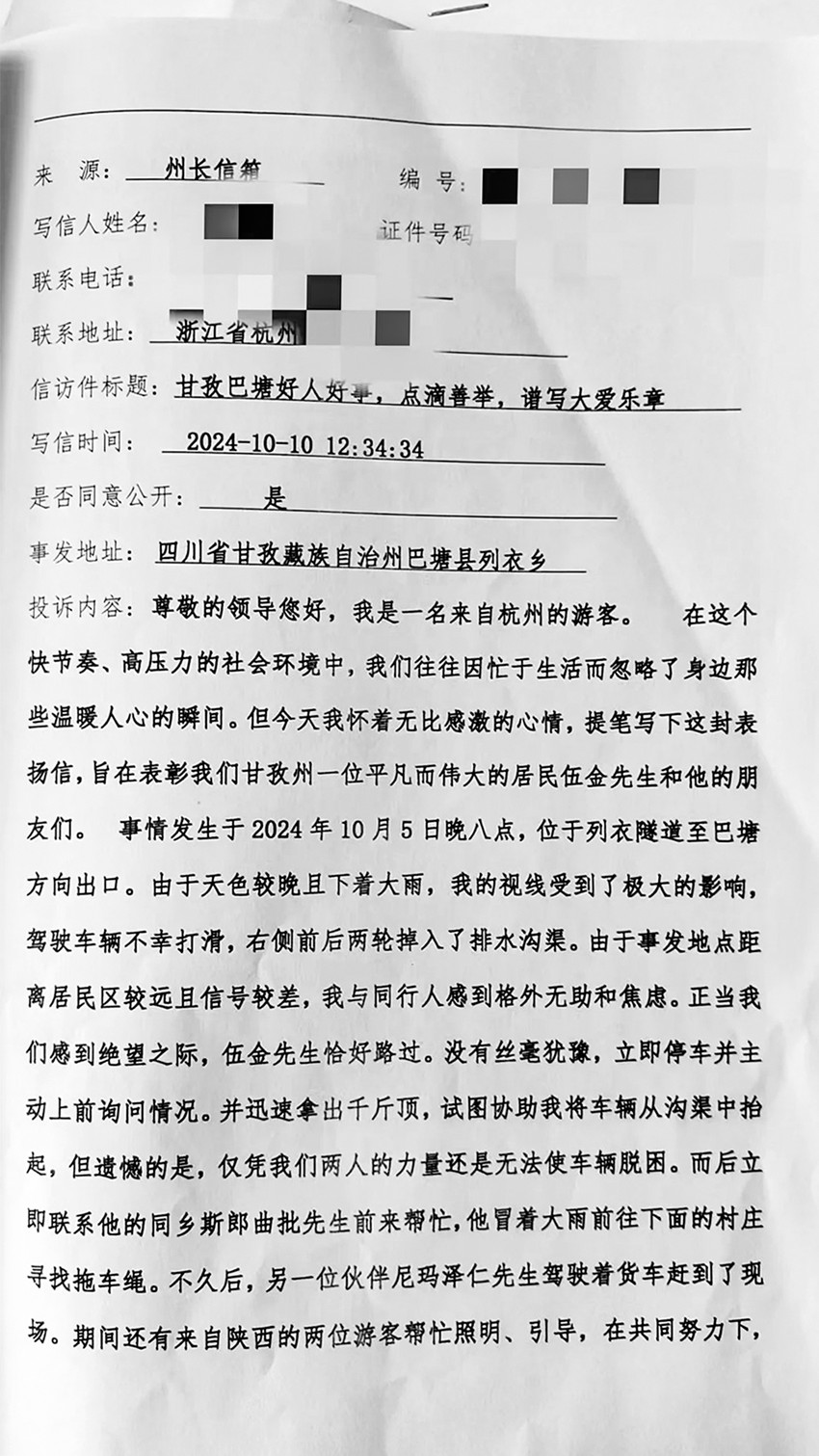一封感謝信,從杭州的網(wǎng)端出發(fā),抵達(dá)“州長(zhǎng)信箱”,再轉(zhuǎn)送到巴塘,跨越千里,情意綿長(zhǎng),引出一段感人至深的好人好事?!白鹁吹念I(lǐng)導(dǎo)您好,我是一名來(lái)自杭州的游客。今天我懷著無(wú)比感激的心情,提筆寫(xiě)下這封表?yè)P(yáng)信,旨在表彰我們甘孜州一位平凡而偉大的居民伍金先生和他的朋友們……”