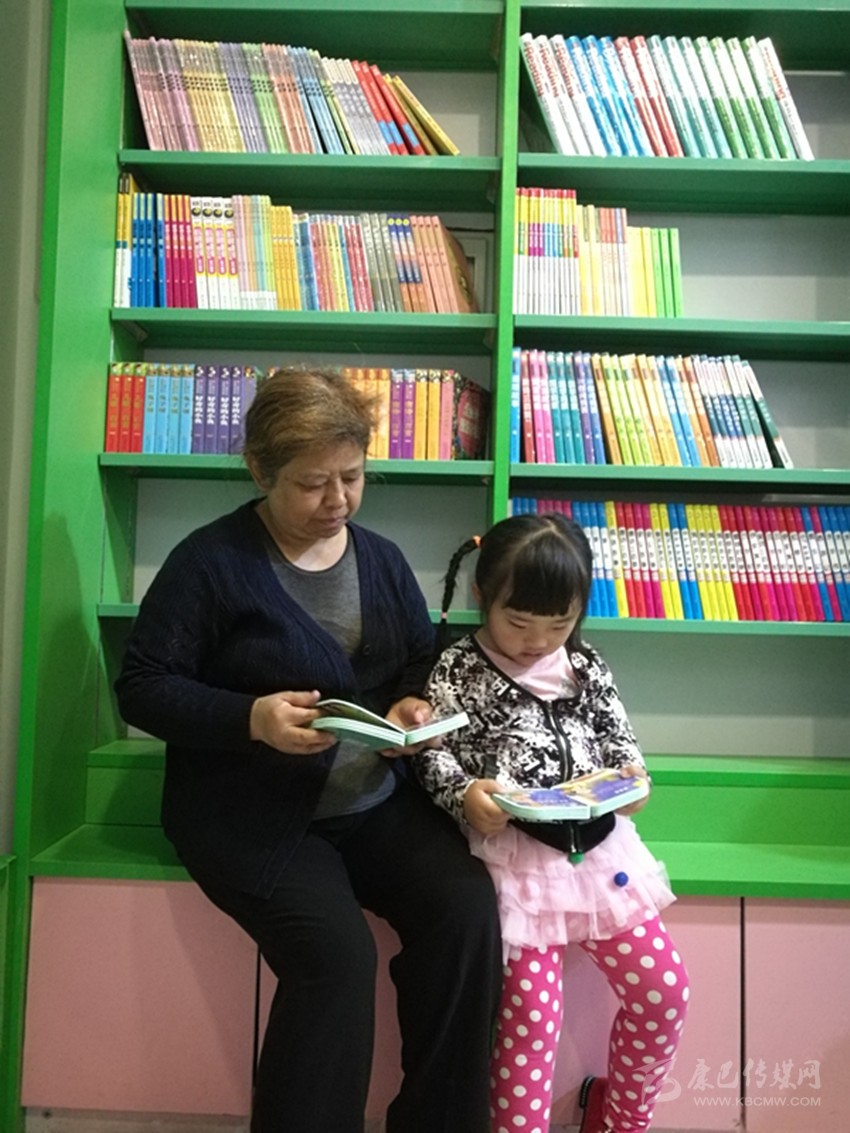 老人陪同孫女看書。