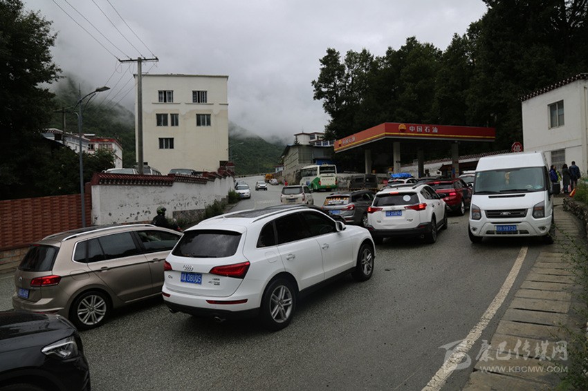 8月7日上午9時10分,中石油康定市折多山加油站,左側(cè)加油進(jìn)車口排起了長龍,記者目測,在加油站進(jìn)口處,等待加油的車輛已排成三排,約有六七十米遠(yuǎn),當(dāng)時等待加油的車輛有43輛。排隊車輛占據(jù)了國道318線此路段一半路面,從折多山方向駛來的車輛很多,有部分車輛沒料到此路段有車輛占道,急忙放緩車速。