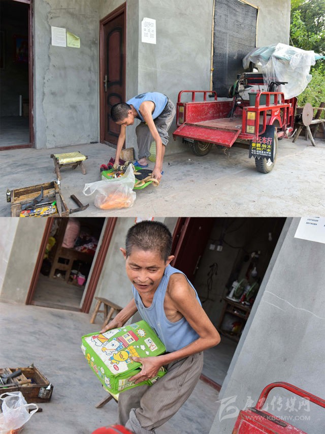 “周強(qiáng)善曾是全鄉(xiāng)最困難的貧困戶?!敝行泥l(xiāng)黨委書記楊壘說,周強(qiáng)善的妻子在剛生下女兒后因病去世。2005年,他在外務(wù)工時(shí)右腿受傷,留下殘疾。后來(lái)他自學(xué)補(bǔ)鞋技術(shù),成了一名鞋匠,但腿腳不便、下山路不通,三娃多年“悶”在家里。