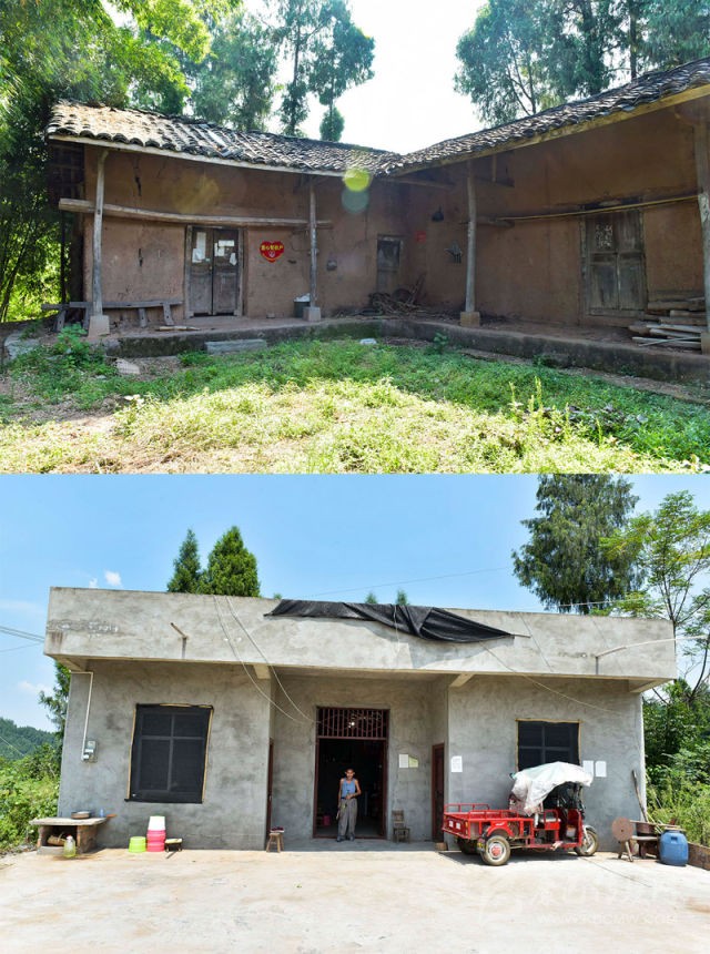 新舊家對(duì)比圖。上圖為周強(qiáng)善家以前的舊屋,下圖為現(xiàn)在鋼混結(jié)構(gòu)的新家。攝影 張可凡