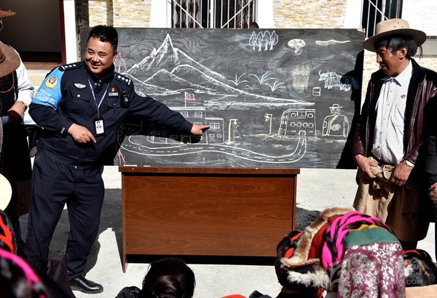 由于轄區(qū)藏族群眾大多都不識(shí)漢字、不會(huì)漢語(yǔ),巴桑呷瓦便將自己的繪畫技藝運(yùn)用到普法教育中,2018年10月,康定市公安局在對(duì)聯(lián)系鄉(xiāng)甲根壩開(kāi)展精準(zhǔn)扶貧工作時(shí),在全市范圍內(nèi)抽調(diào)了巴桑呷瓦等10名富有群眾工作經(jīng)驗(yàn)的民警,他一邊負(fù)責(zé)沙德鎮(zhèn)派出所日常工作,一邊負(fù)責(zé)兼職扎日村精準(zhǔn)扶貧工作,用繪畫的方式為牧民群眾描繪脫貧致富夢(mèng)。他把國(guó)家的相關(guān)法律法規(guī)、民族政策和惠民工程政策吃透并制作成故事性強(qiáng)、通俗易通的簡(jiǎn)筆畫冊(cè)向老百姓解讀、宣講。在巴桑呷瓦妙趣橫生、詼諧幽默的“授課”下,深?yuàn)W的法律政策變得淺顯易懂?!八漠嬓蜗笊鷦?dòng),接地氣,有我們的生產(chǎn)生活場(chǎng)景,我們喜歡看,他的講解幽默風(fēng)趣,我們聽(tīng)得懂,只要他一下來(lái),村民都圍在他的身邊,舍不得離開(kāi)?!痹沾宓拇迕褚呀?jīng)把這位“畫家”警察當(dāng)作了自家人。