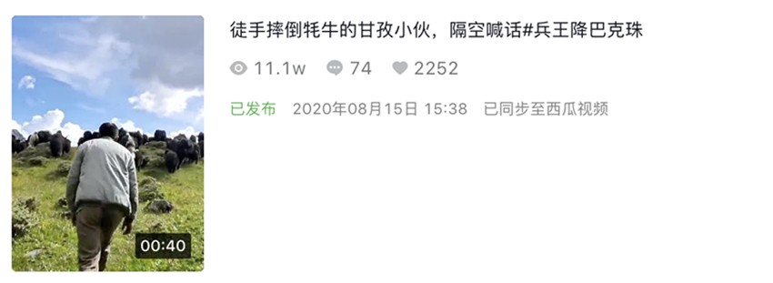8月3日,這段僅有10秒長(zhǎng)的視頻,在抖音短視頻平臺(tái)《甘孜日?qǐng)?bào)》康巴傳媒抖音號(hào)發(fā)布后,短短一天內(nèi)獲得了800多萬(wàn)次播放量,200多名網(wǎng)友留言評(píng)論,18萬(wàn)次點(diǎn)贊更是“宣告”其正式成為“網(wǎng)絡(luò)爆款”。